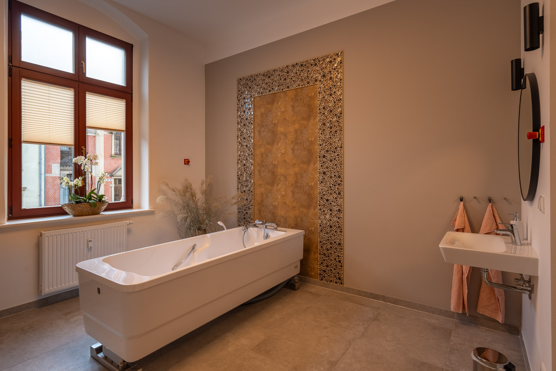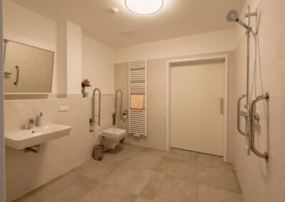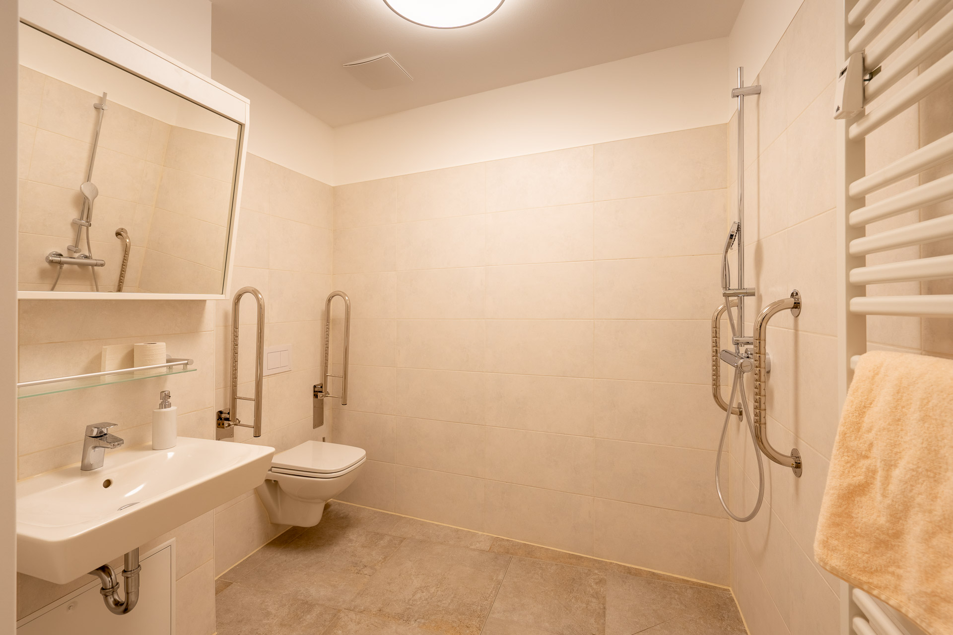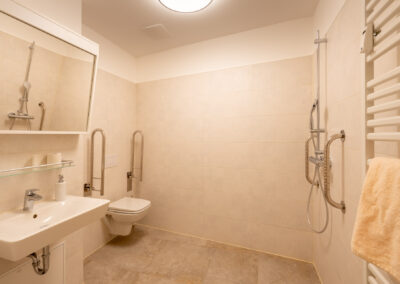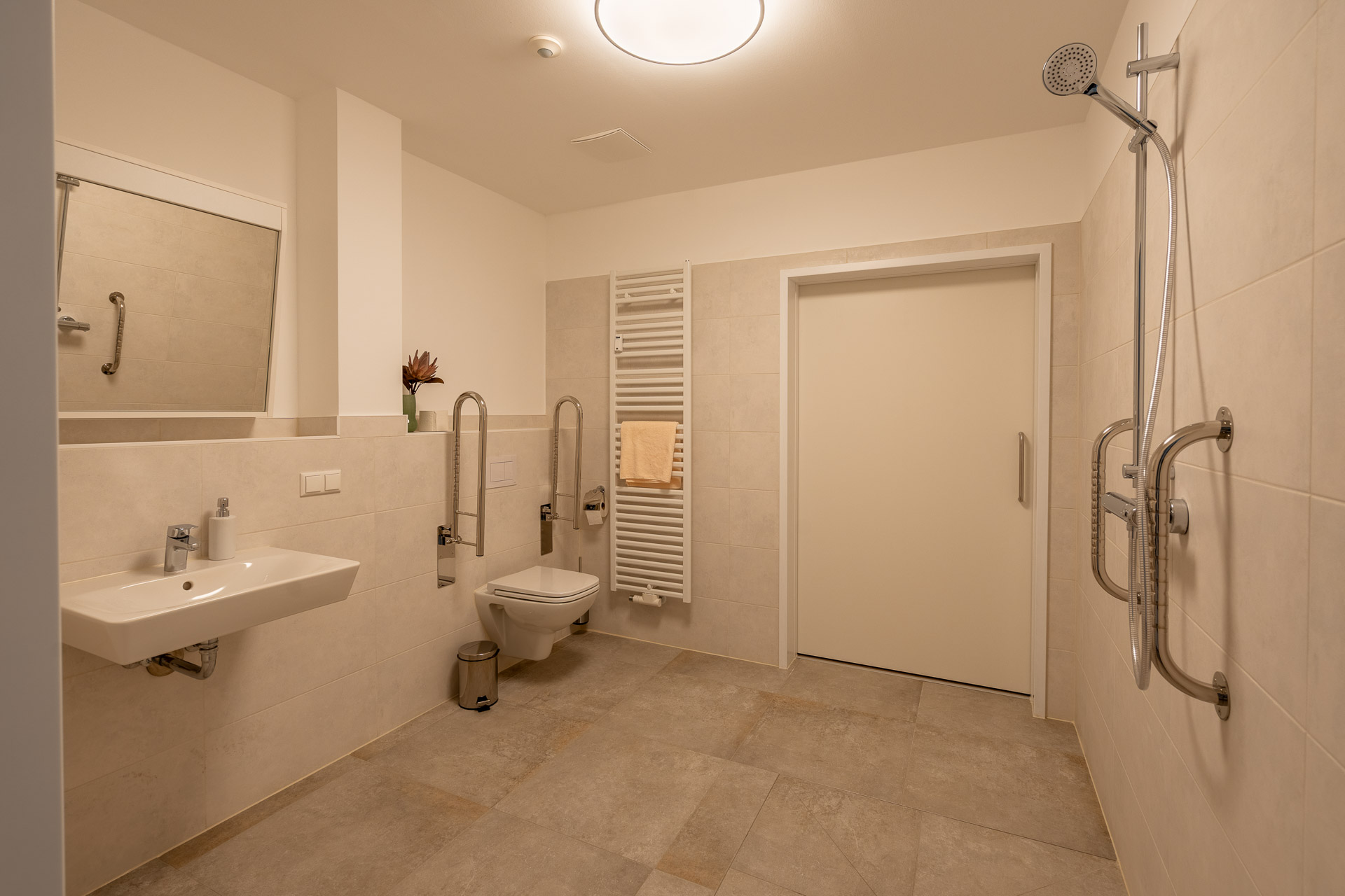 Ebenso liebevoll ist unser Pflegebad ausgestattet. Eine Hubbadewanne erleichtert den Einstieg und ein integriertes Lichtspiel sorgt für eine entspannte Atmosphäre.