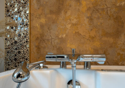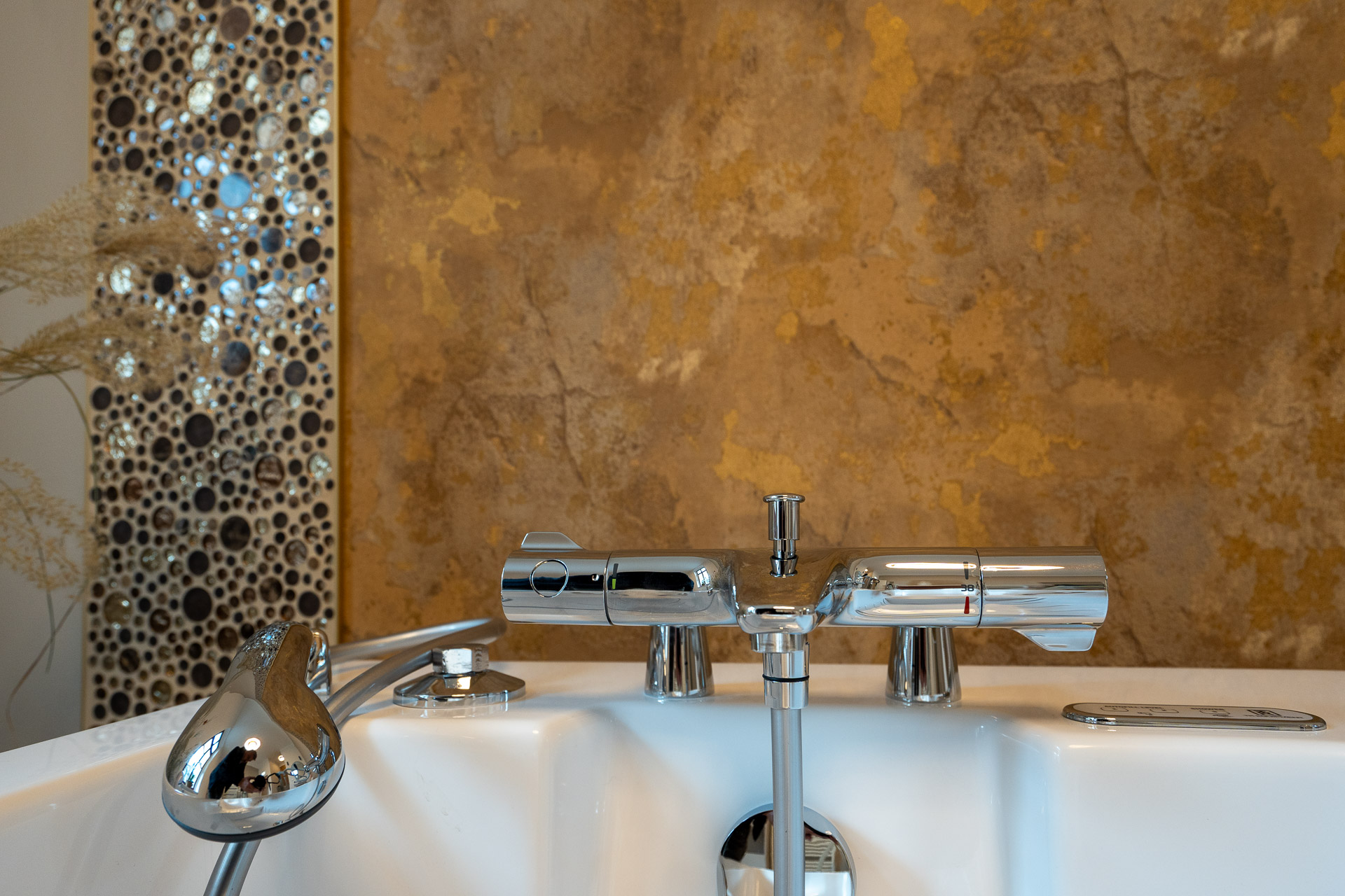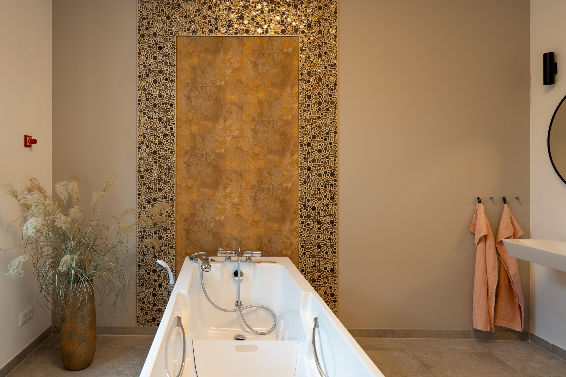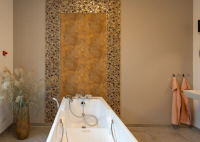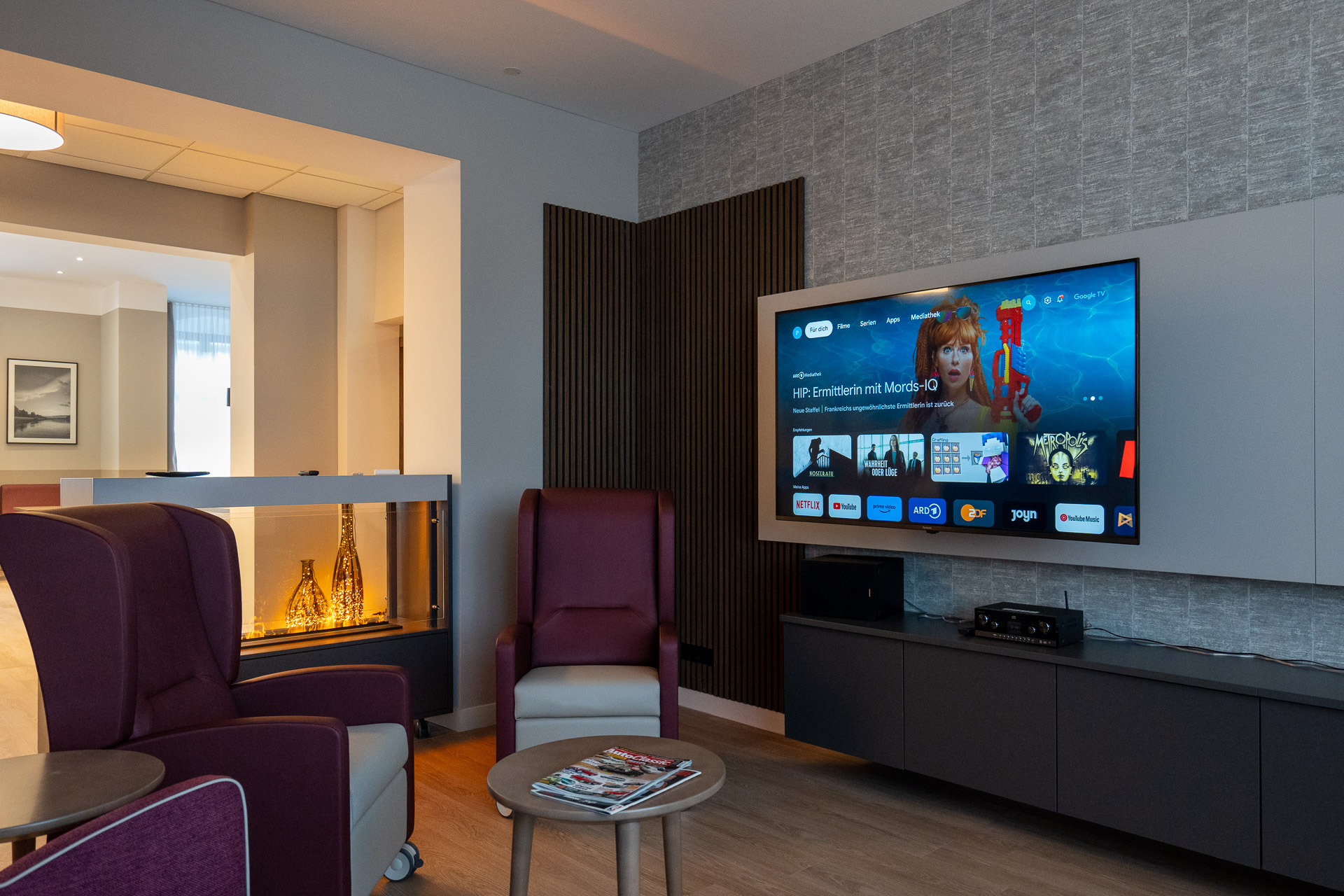Ebenso liebevoll ist unser Pflegebad ausgestattet. Eine Hubbadewanne erleichtert den Einstieg und ein integriertes Lichtspiel sorgt für eine entspannte Atmosphäre.