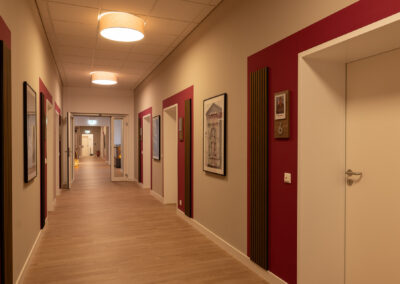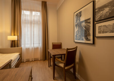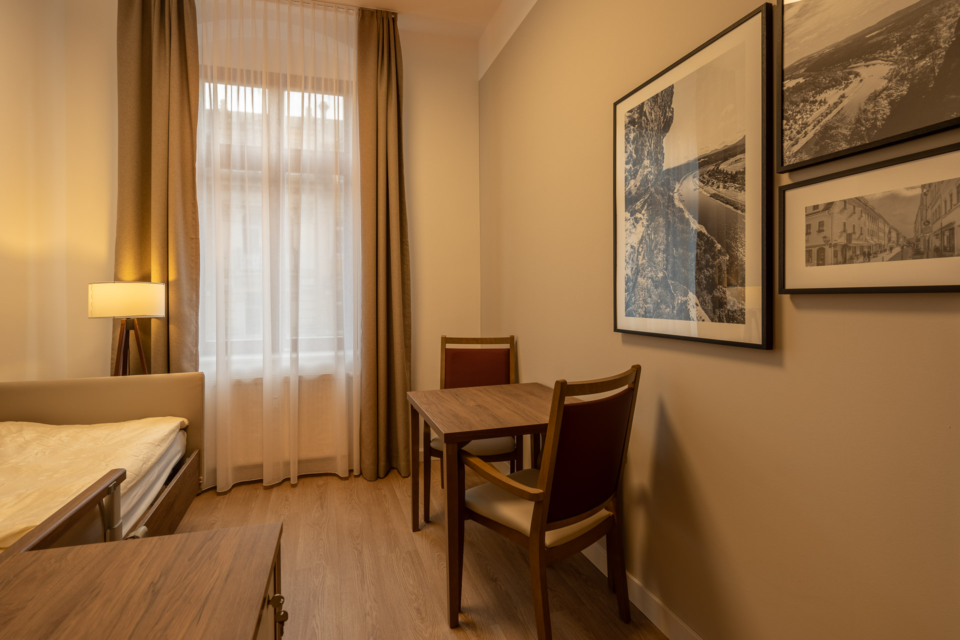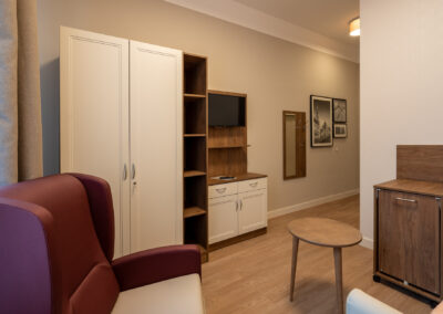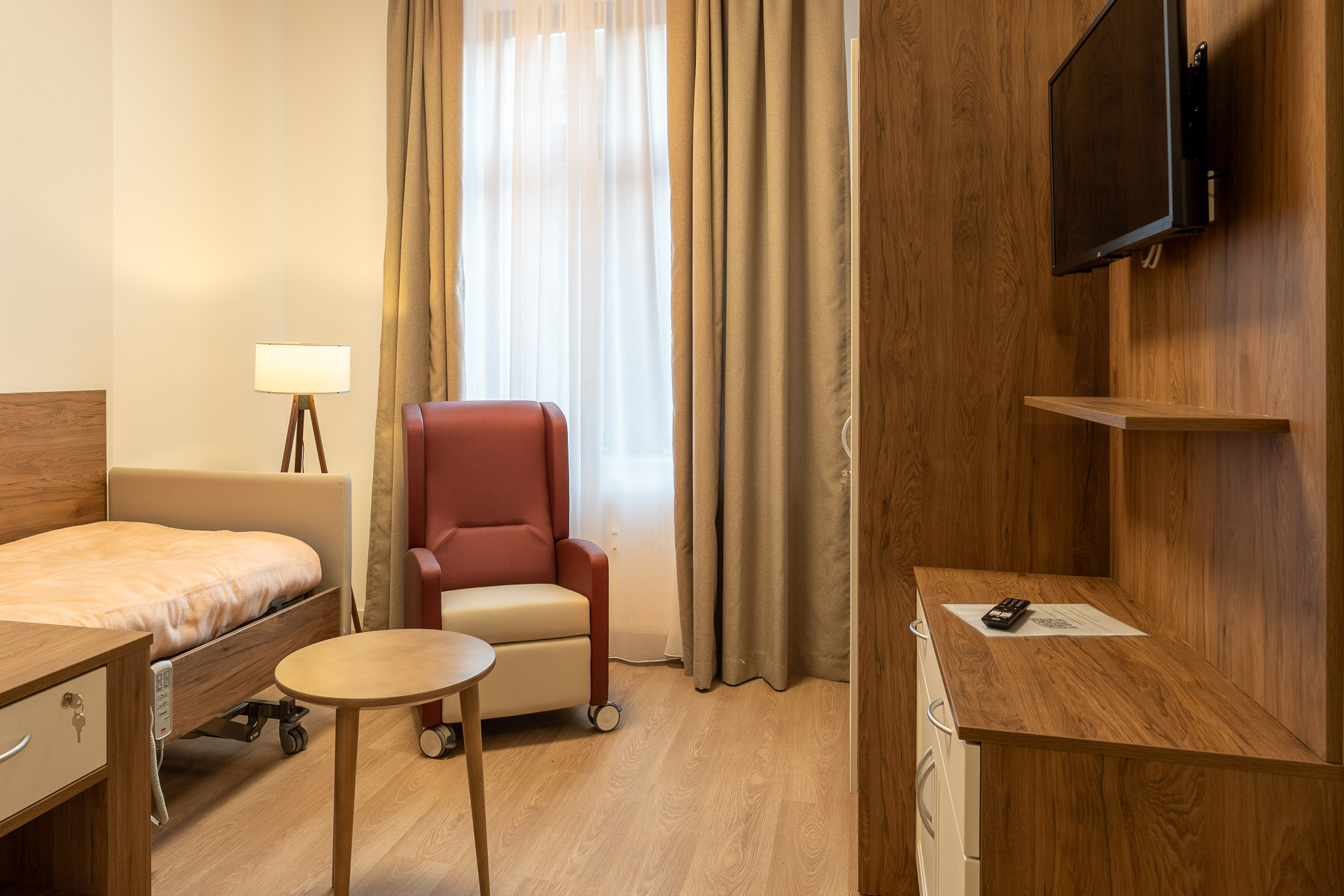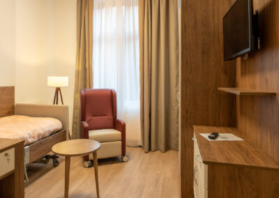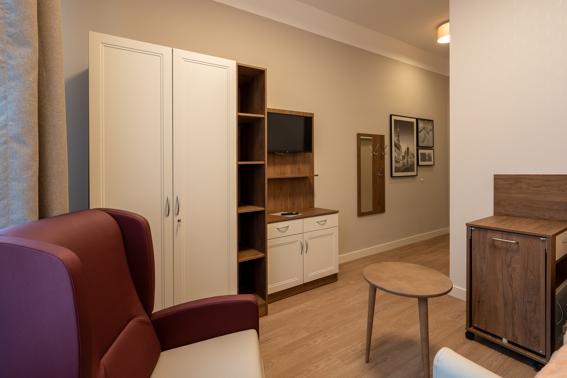 Die Privatzimmer sind übersichtlich, funktional und hell eingerichtet und grenzen an den Gemeinschaftsbereich. Die Räume sind möbliert und verfügen über ein hochwertiges Pflegebett.